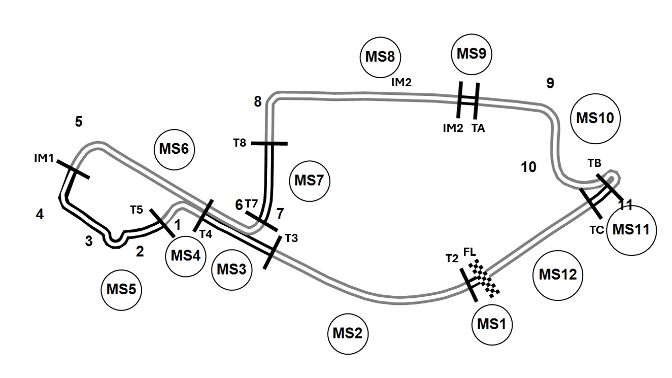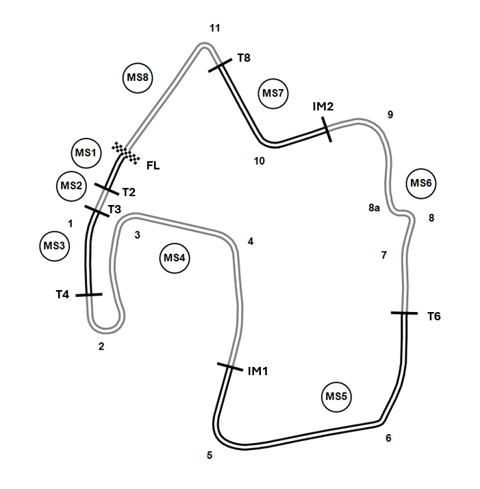 | Laguna Seca | FL,T2;T2,T3;T3,T4;T4,IM1;IM1,T6;T6,IM2;IM2,T8;T8,FL |